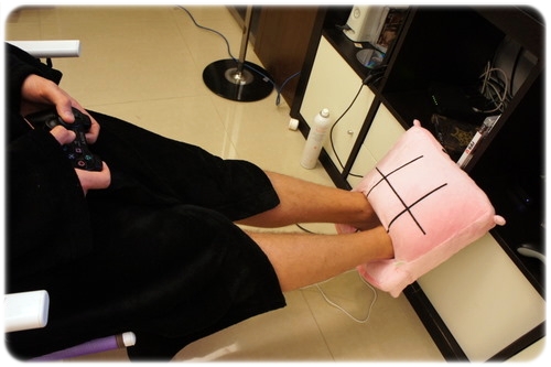 再仔細看一下, 這小子真的很懂的享受耶~ 因為玩電動怕腳會冰冰的, 所以就把萌萌拿來用