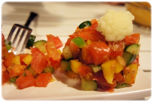 番茄、青椒、巴西里、摩洛哥香料,切成丁狀, 交錯成五顏六色的沙拉,口感就是酸v啊酸v的, 非常的清新爽口