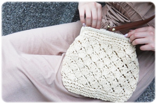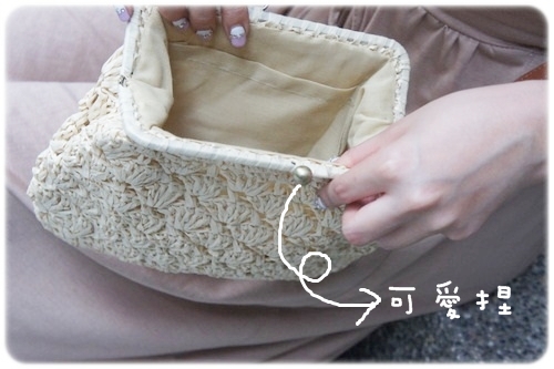 接下來這個小包包, 最近柚柚很常揹, 是可愛的藤編斜背包, 而且編成貝殼的形狀好可愛!