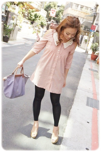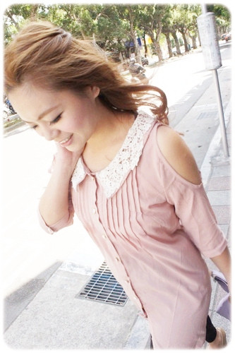 淡淡的粉膚色看起來很有氣質, 有我愛的挖肩還有在領子上做了白色蕾絲的裝飾, 重點是長版的, 可以遮住屁屁兒
