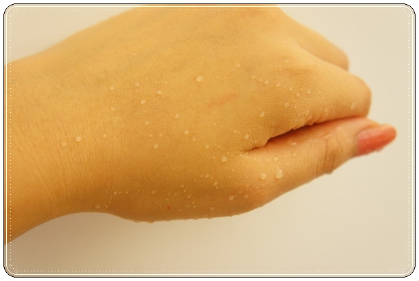 ❥把塗上粉底的手背去手龍頭沖水, 可以看到手背上的水珠兒 ( 按個讚)