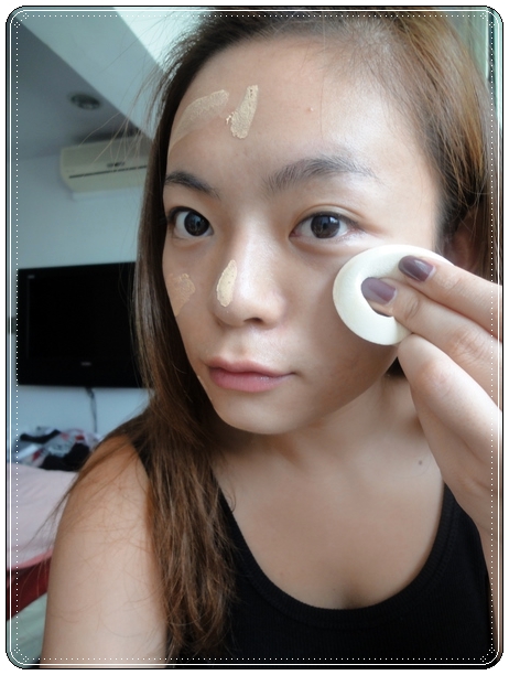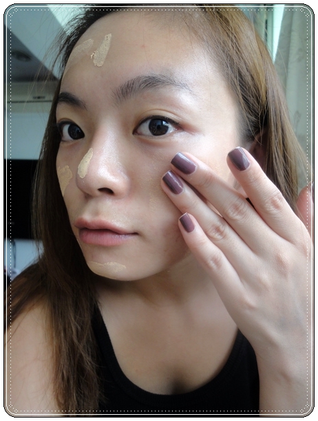把賴床粉底分別點在臉上 (用量不需要太多)