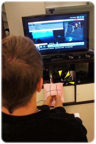 再仔細看一下, 這小子真的很懂的享受耶~ 因為玩電動怕腳會冰冰的, 所以就把萌萌拿來用