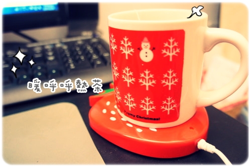 只要插上USB, 小草莓上方就會亮紅燈, 然後就可以讓熱飲保持暖暖的溫度