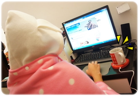 插上USB會暖呼呼的! 不過像法國麵包他有時就單純喜歡把腳放進去, 他說他很喜歡, 覺得很有安全感