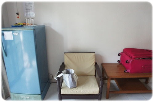 房間內也有一個冰箱(裡面的所有飲料都要另外付費的) 還有一些桌椅可以讓旅客放置行李箱等雜物