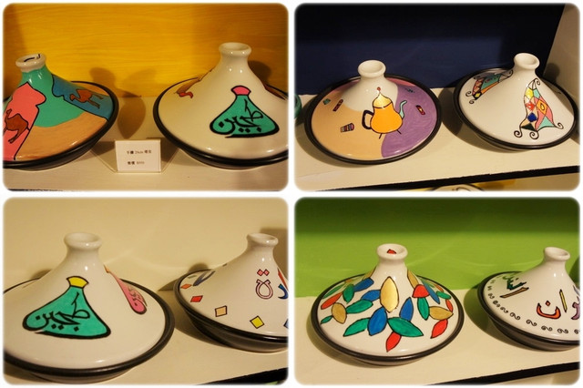 上頭擺著各式各樣的繪塔吉鍋 Tajin】