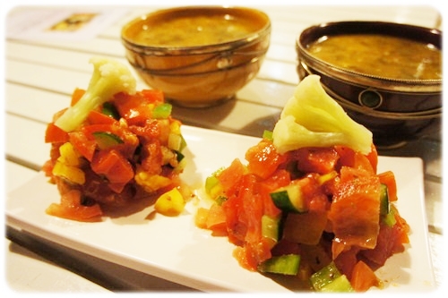 番茄、青椒、巴西里、摩洛哥香料,切成丁狀, 交錯成五顏六色的沙拉,口感就是酸v啊酸v的, 非常的清新爽口