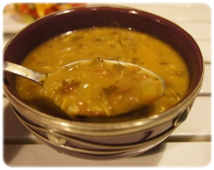 以扁豆、巴西里、蕃茄、洋蔥和摩洛哥香料一塊燉煮入味, 香料的味道很迷人,是個很特別的湯