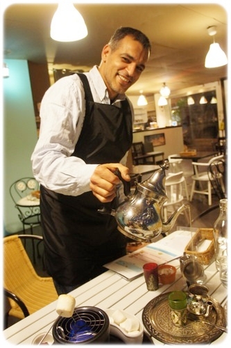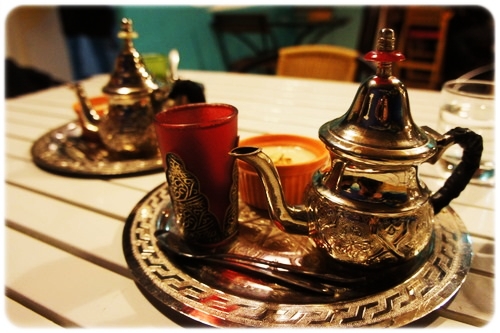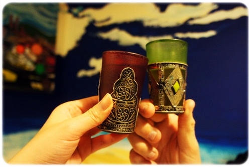 精緻的銀托盤,擺放著異情色彩濃厚  花紋繁複的摩洛哥茶杯, 配上現場的異國風音樂,真的有如置身於摩洛哥北非風情般