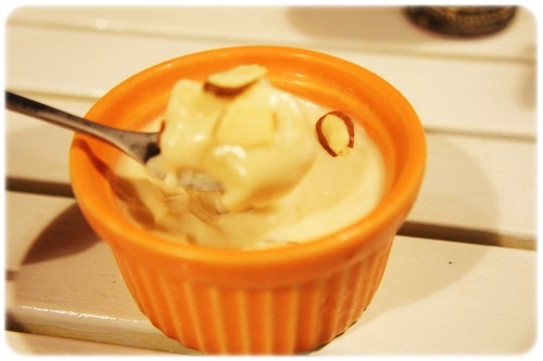 口感Q軟又滑順, 上方灑了一些杏仁片, 配上一口米布丁, 你會發現嘴裡充滿著杏仁香氣還有米香