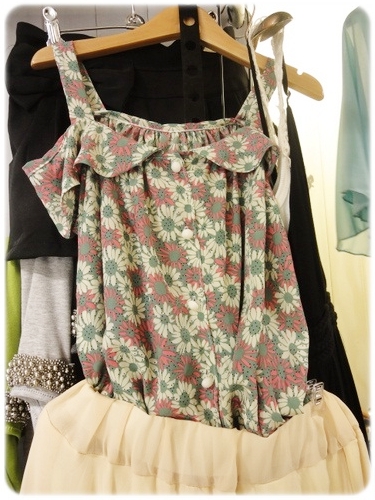 看到好多今年流行的花花挖肩上衣, 這種上衣搭個雪紡長裙會很韓風, 搭個牛仔短褲也很可愛