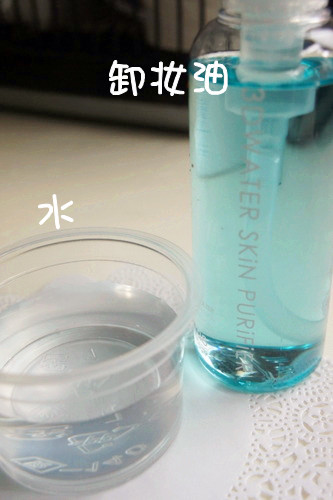 準備的工具: 裝著清水的容器以及卸妝油少許(按壓一次的量)