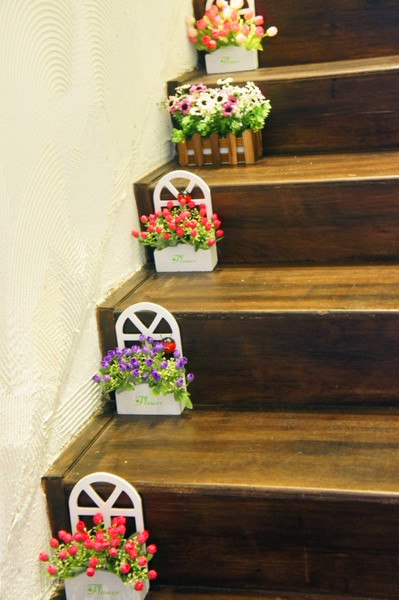 往咖啡廳的樓梯間上面擺著很多可愛的小花擺飾