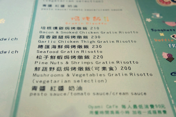 餐點選擇大概有義大利麵/焗烤飯/輕食三明治/下午茶/飲料